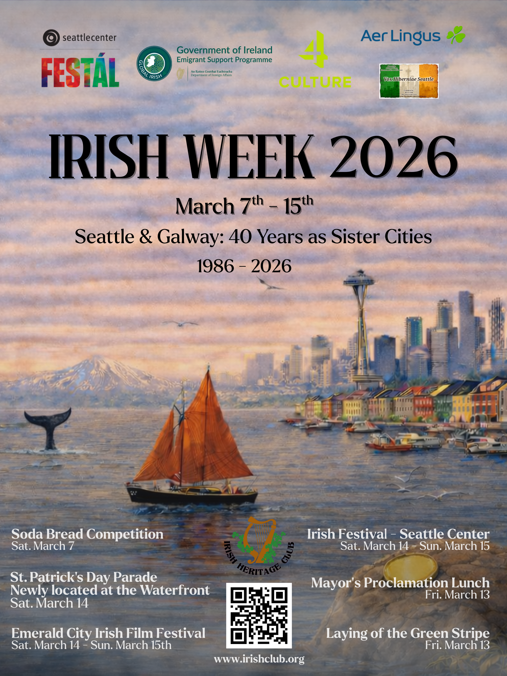 Irish Week 2026, hosted by the Irish Heritage Club of Seattle, will be a landmark celebration of Irish culture, heritage, and community—honoring the 40th anniversary of the Seattle–Galway Sister City Association and the enduring friendship between our two cities.