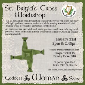 IHC is delighted to welcome Scian Hayes, a talented local artist (scianfollyhayes.com), who will guide us in the traditional making of St Brigid’s Crosses, a practice deeply rooted in Irish history and folklore. For centuries, families across Ireland gathered on the eve of St Brigid’s Day to weave crosses from rushes or straw. It was believed that St Brigid would visit homes that night, blessing them for the year ahead. Hanging the cross above the doorway symbolized protection from harm, along with hopes for health, abundance, and renewal as spring approached. This workshop honors that tradition by bringing people together to share stories, learn the history of St Brigid and her legacy, and take part in a ritual that has been passed down through generations. We will run two workshops: the 1st workshop @ 2pm and 2nd workshop @ 2.45 pm. All materials will be provided and you are welcome to bring ribbon, yarn, or flexible plant materials of personal significance to incorporate into your cross. Participants will create a cross to bring home and hang on St Brigid’s Eve, continuing a timeless Irish custom. Tea, coffee and snacks will be provided. Suitable for children ages 5 and up; all are welcome. Registration is required via this link https://www.eventcreate.com/e/st-brigid-cross-workshop