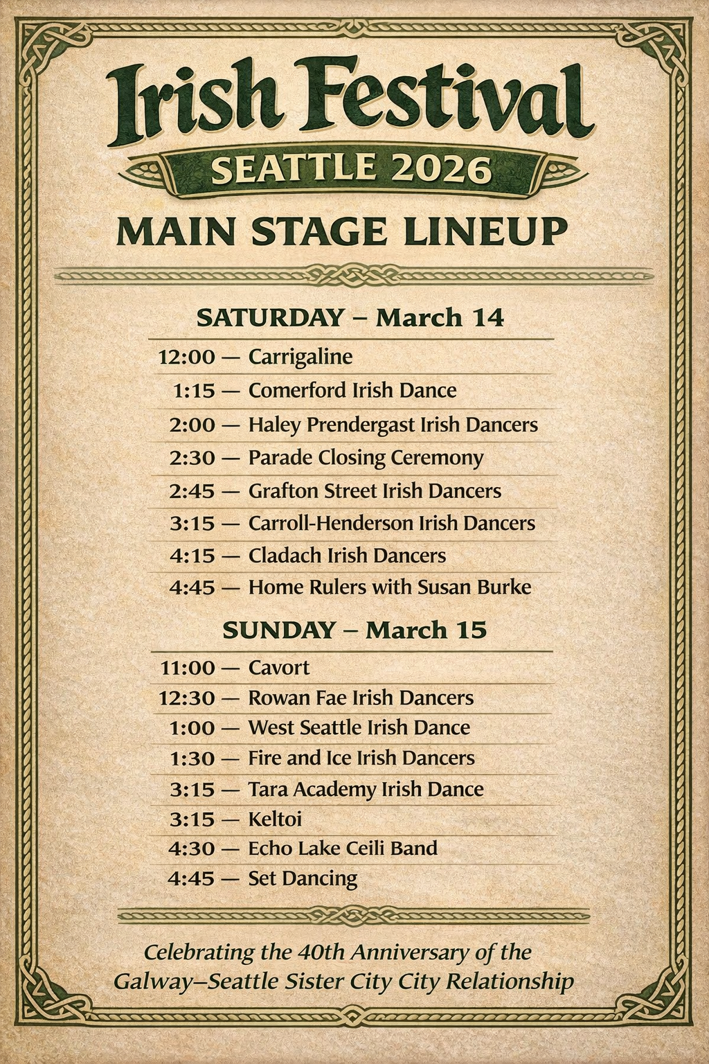 The Main Stage at Irish Festival Seattle 2026 showcases a mix of traditional Irish music, and Irish dance.